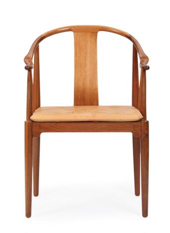 Hans J. Wegner: "Kinastolen". Armstol med stel af valnød. Løs sædehynde betrukket med lyst skind. Udført 1977 hos Fritz Hansen.