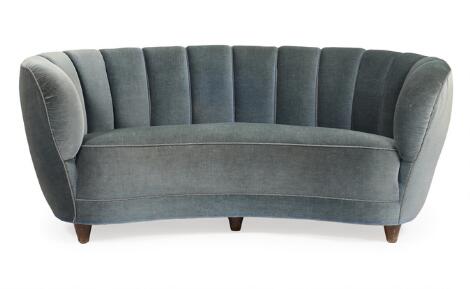 Dansk møbeldesign: To-personers overpolstret sofa i buet form med kegleformede ben af bøg. 1930–40'erne. L. 163.