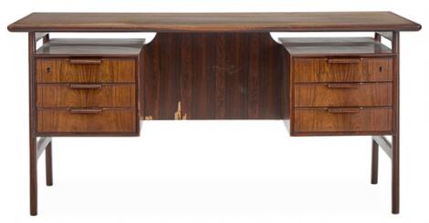 Gunni Omann: Skrivebord af palisander, front med seks skuffer. Udført hos Omann Junior. H. 73. L. 153. B. 80.