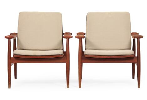 Finn Juhl: "Spadestolen". Et par lænestole med stel af teak. Løse hynder med beige møbelstof. Udført hos France & Søn. (2)