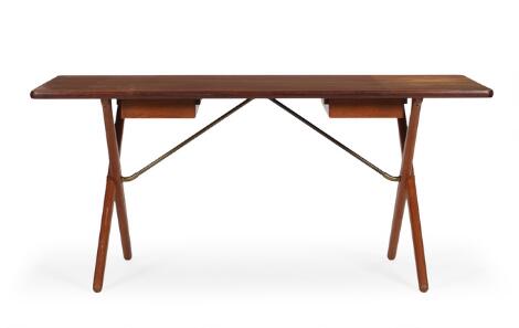 Hans J. Wegner: "AT 303". Skrivebord med plade af teaktræ, krydsbensstel og skuffer af egetræ. Udført hos Andreas Tuck. H. 72. L. 160. B. 86.