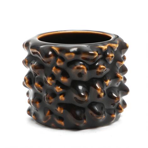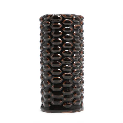 Axel Salto: Cylinderformet vase af stentøj, modelleret i knoppet stil, dekoreret med brun olivin glasur. Sign. Salto, Kgl. P. 20707. H. 8,5.