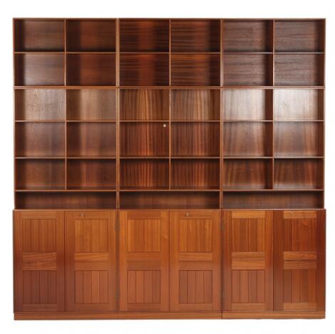 Mogens Koch: Reolvæg af massiv mahogni, bestående af tre skabe med sokler, tre bogkasser, tre 2/3 bogkasser samt tre mellemsokler. (15)
