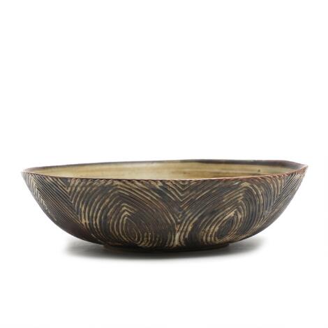 Axel Salto: Cirkulær skål af stentøj, yderside modelleret i riflet stil. Dekoreret med Sung glasur med blå elementer. Diam. 29.