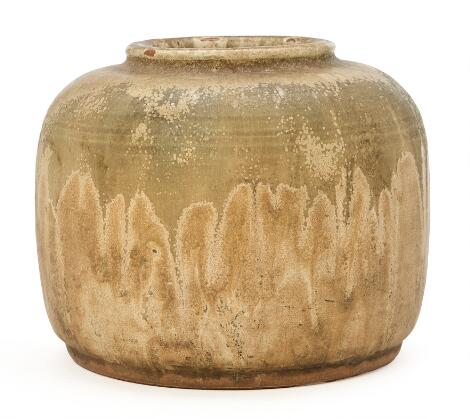 Patrick Nordström: Rund vase af stentøj, dekoreret med okkerbrun og grågrøn glasur. Sign. monogram, S60. Kgl. P. H. 13,5. Diam. 16.
