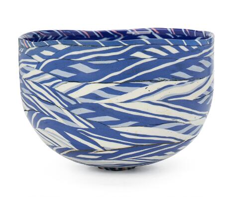 Hans Munck Andersen: Rund skål af indfarvet porcelænsmasse i blåt, hvidt og rosa. Sign. monogram, XXX X. Unik. H. 11,4. Diam. 16-16,5.