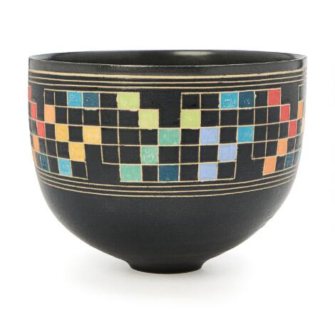 Vibeke Fischer: Skål af stentøj, dekoreret med gråsort glasur. Udvendigt dekoreret med polykrom dekor i kvadratiske felter.