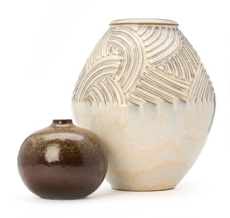 Finn Lynggaard: To vaser af stentøj, ene med indridset reliefdekor. H. hhv. 27,5 og 11,2. (2)
