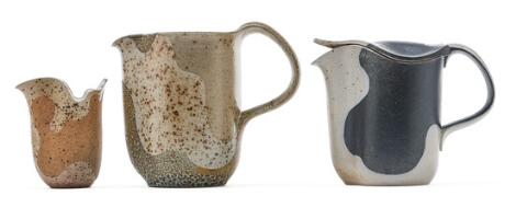 Bente Hansen: Tre kander af stentøj, dekoreret med hhv. saltglasurer, grå samt mat sort glasur. Tryksign. monogram. Unika. H. 12,5-18,5. (3)