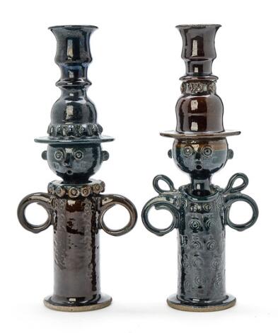 Bjørn Wiinblad: Et par lysetstager af hårdtbrændt lertøj, modelleret i form af personer med hat. H. 28. (2)