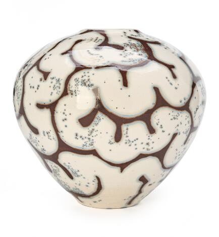 Per Weiss: Rund vase af keramik. Dekoreret med organiske mønstre i transparent, blå og rødbrun glasur. Diam. 19.