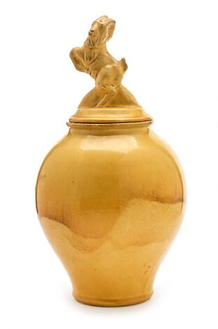 Knud Kyhn: Rund lågkrukke af lertøj, låg modelleret med stenbuk. Dekoreret med uranglasur. H. 32.