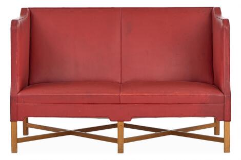 Kaare Klint: To pers. sofa med krydsstel af mahogni. Betrukket med mørkerødt skind. Model 4118.