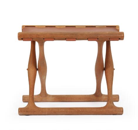Poul Hundevad: "Guldhøj stol". Foldeskammel med krydsstillet stel af massiv eg. Model PH 41. Poul Hundevad.