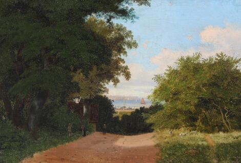 Edvard Petersen: Udsigt fra skovvejen mod det solbelyste, stille hav med sejlskibe. Sign. Edvard. Olie på lærred. 38 x 55.