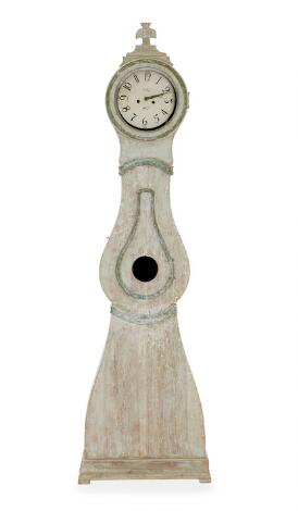 Svensk almue standur i kasse af grønmalet træ, rund skive af bemalet metal. Sign. OLS No. 969. Västergötland, 19. årh.s begyndelse. H. 237. B. 66. D. 24.