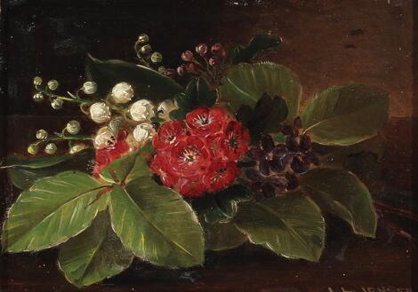 I. L. Jensen: Opstilling med buket af liljekonvaller, violer og bøgeblade. Sign. I. L. Jensen. Olie på træ. 14 x 20 cm.