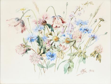 Olga Alexandrovna: Farverige markblomster. Sign. Olga 1944. Vandfarve på papir. Lysmål 24,5 x 32 cm.