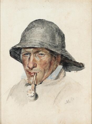 Michael Ancher: Portræt af en piberygende skagensfisker. Sign. M. A. Vandfarve på papir. Lysmål 23,5 x 18 cm.