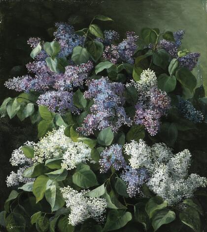 Emmy Thornam: "Hvide og lilla Syrener". Sign. E. Thornam. Olie på lærred. 68 x 60,5 cm.