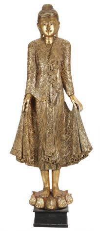 kThailandsk Buddha af udskåret og forgyldt træ, prydet med spejlflusser. 20. årh. H. inkl. sokkel 228.