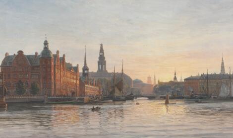 Vilhelm Arnesen: Solopgang over Københavns havn. Sign. Vil. Arnesen 1923. Olie på lærred. 47 x 77.