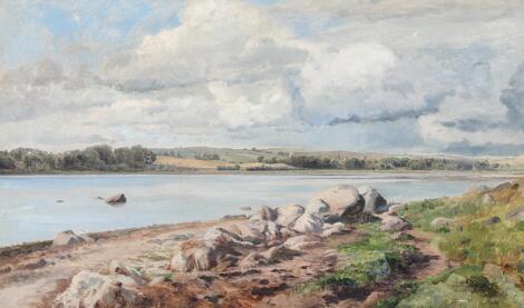 Janus la Cour: Stenet strandbred, antageligt ved Kalø Vig. Sign. J la Cour. Olie på lærred. 45 x 76.