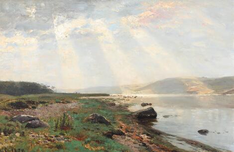 Godfred Christensen: Sollys over Silkeborgsøerne. Sign. GC, 1879. Olie på lærred. 41 x 63.