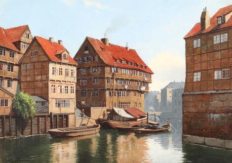 August Fischer: Parti fra Bleichenfleeth, Hamborg. Sign. Aug. Fischer. Olie på lærred. 38 x 55.
