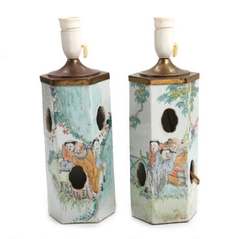 Et par kinesiske hatstands af porcelæn, sekskantet form. Monteret som bordlamper. 19. årh.s slutning. H. 26,5. (2)
