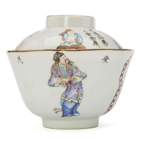 Kinesisk lågskål af porcelæn, dekoreret i emaljefarver med historiske figurer og kalligrafi. Tongzhi seglmærke og fra perioden. Diam. 10,5 cm.