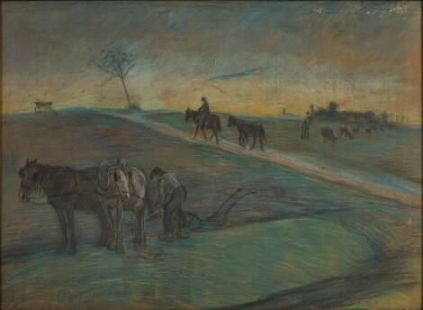 Theodor Philipsen: "Fyraften. Pløjemanden rider hjem". 1912. Sign. monogram. Pastel på papir monteret på lærred. 100 x 135 cm.