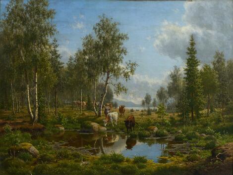 Carl Bøgh: Parti fra en skov med køer ved et vandhul. Sign. Carl Bøgh. Olie på lærred. 108 x 141 cm.