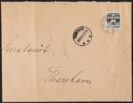 1941. 20/1 øre. pos. 39 "KORT BJÆLKE". Single på beskåret brev annulleret med stjernestempel MYGGENÆS og sidestemplet THORSHAVN 20.5.41.