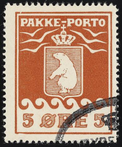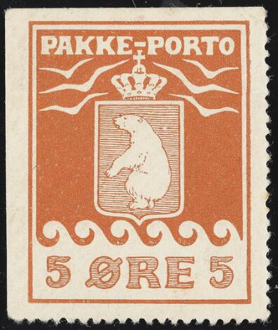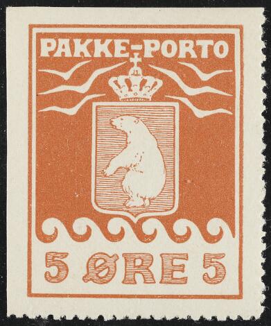 1910. Thiele. 5 øre, 2. tryk, 2 sider UTAKKET. Pænt ubrugt eksemplar. Meget lille tyndhed på bagsiden ved bjørnens hoved. (AFA 9000 kr.)