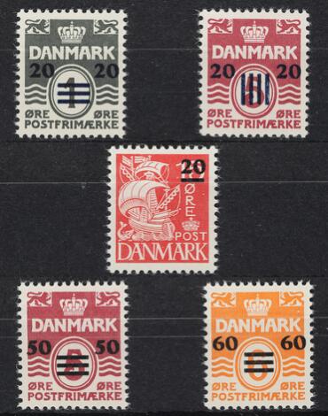 Danmark. Frederik VIII. Komplet sæt med trissefejl inkl. 5 øre i 4-stribe på brev med trissefejl i 3. mærke.