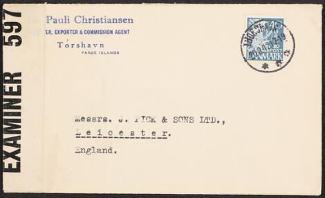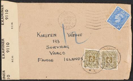 1943. Brev fra england frankeret med 2 1/2 d. gået gennem censur og påsat 2 x 6 øre portomærker (fra Danmark) ved ankomst THORSHAVN.