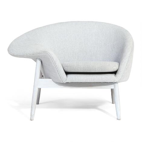 Hans Olsen: "Fried Egg". Asymmetrisk lænestol med stel af laseret træ, betrukket med møbelstof. Fremstillet hos Warm Nordic.