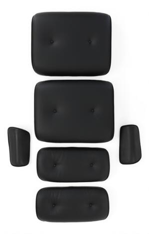 Charles Eames, Ray Eames: Hyndesæt til "Lounge Chair" Lænestol og skammel betrukket med sort skind. Udført hos Vitra.