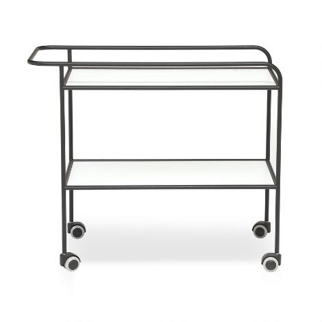 Shiro Kuramata: "Steel Pipe Drink Trolley". Serveringsbord af mat sort metal, hylder af hvid laminat. H. 70. L. 82. B. 42.