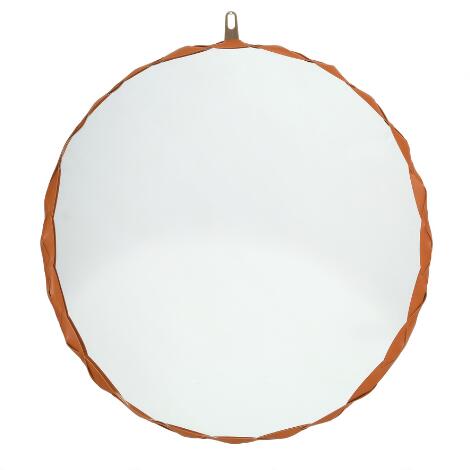 Atelier Oï: "Raperonzolo", spejl i ramme af flettet læder. Formgivet i 2015. Udført hos Zanotta. Diam. 105.