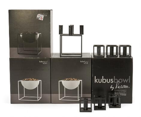 Mogens Lassen / Søren Lassen: "Kubus" skåle og lysestager af sort- og hvidlakeret stål. Udført af By Lassen. (12)