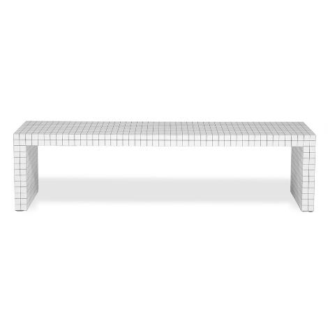 Superstudio: "Quaderna". Bænk af kvadratvinklede krydsfinerplader beklædt med hvid laminat med grafisk sort mønster. Udført hos Zanotta.
