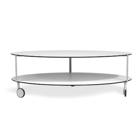 Anna Deplano: "Giro". Sofabord med top af hvid laminat, tre-benet stel på hjul. Fremstillet hos Zanotta. H. 36,5 Diam. 110.