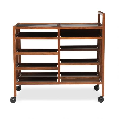 Bodil Kjær: Serving trolley in walnut, top with two aluminum panels, plastic wheels. H. 82 cm, W. 69 cm, D. 55 cm.