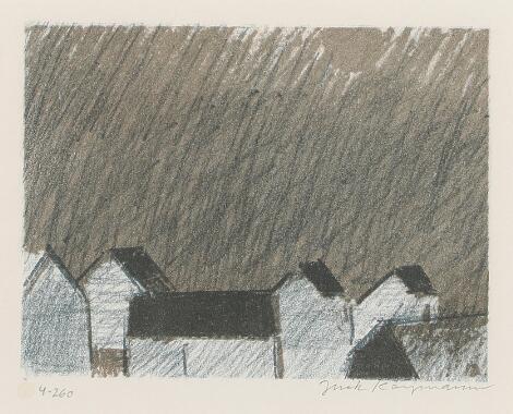 Jack Kampmann: Houses, The Faroe Islands. Two compositions. Signed. Lithograph in colours. Visible size 18 x 22 cm. (2)