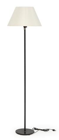 Dansk design: Standerlampe med fod af sortmalet metal, stamme omviklet med flettet skind. H. 162.
