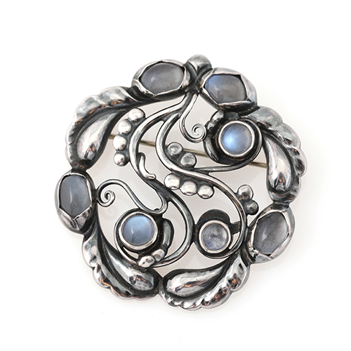 Georg Jensen grundlagde i 1904 en sølvsmedje i Bredgade 36. I de tidlige år formgav Georg Jensen næsten alt selv ud fra idéen om, at smykkerne prismæssigt skulle være tilgængelige for flere. Derfor benyttede han aldrig guld, men det hårde ”A380-sølv”. For at distancere sig fra tidens billige materialer og masseproduktion blev Jensen kendt for at bearbejde sølvets overflade. Smykkerne var ofte prydet med eksotiske og anderledes halvædelsten som rav, agat, koral, lapis lazuli og carneol. Stenene var ikke facetterede, men cabochonslebne og matte. Fra 1906 tilknyttede han kunstmaleren Johan Rohde, der udarbejdede tegninger af skulpturelle plantemotiver. Stilarten var skønvirke, hvis motiver som blomster, blade og bær blev hentet fra naturen. Og som den drevne forretningsmand Georg Jensen var, påtog han sig også gerne usædvanlige bestillingsopgaver for almindelige privatkunder. Udover de ældre smykker på vores Onlineauktion kan man byde på smykker designet til Georg Jensen af fremragende danske smykkedesignere som Nanna og Jørgen Ditzel, Vivianna Torun Bülow-Hübe og ikoniske Henning Koppel.