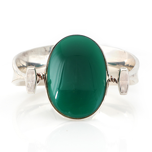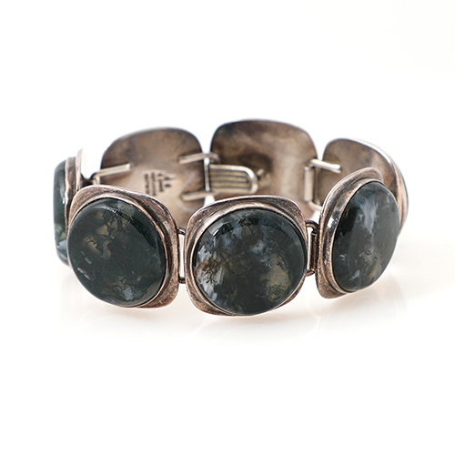 Netop i afdelingen for de mere moderne smykker finder vi Bent Knudsens værk. Han blev udlært bestik-smed hos C.M. Cohr i Fredericia. Efter nogle år med ansættelse hos Hans Hansen åbnede Bent Knudsen i 1956 egen sølvsmedje i Kolding sammen med hustruen Anni. Her fremstilledes et stort sortiment af fortrinsvis sølvsmykker i geometriske figurer, mange med sten, en del korpusarbejder og store mængder af papirklip, der blev udstanset på værkstedet og samlet til mobiler. En klar og enkel formgivning er karakteristisk for Anni og Bent Knudsens smykker, ofte geometrisk formede led, der griber ind i hinanden. Ud over bestillingsarbejder for det danske og svenske kongehus havde Bent Knudsen en omfattende eksport til store dele af verden. Med på auktion er to fine armbånd, begge i Knudsens særegne kantede og rå stil.