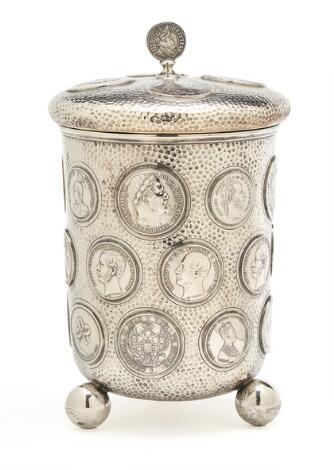2545/8024LyngbyA German silver and medal-set covered beaker. D. Vollgold & Sohn, Berlin. C. 1900. Weight 1,087 g. H. 24 cm.
